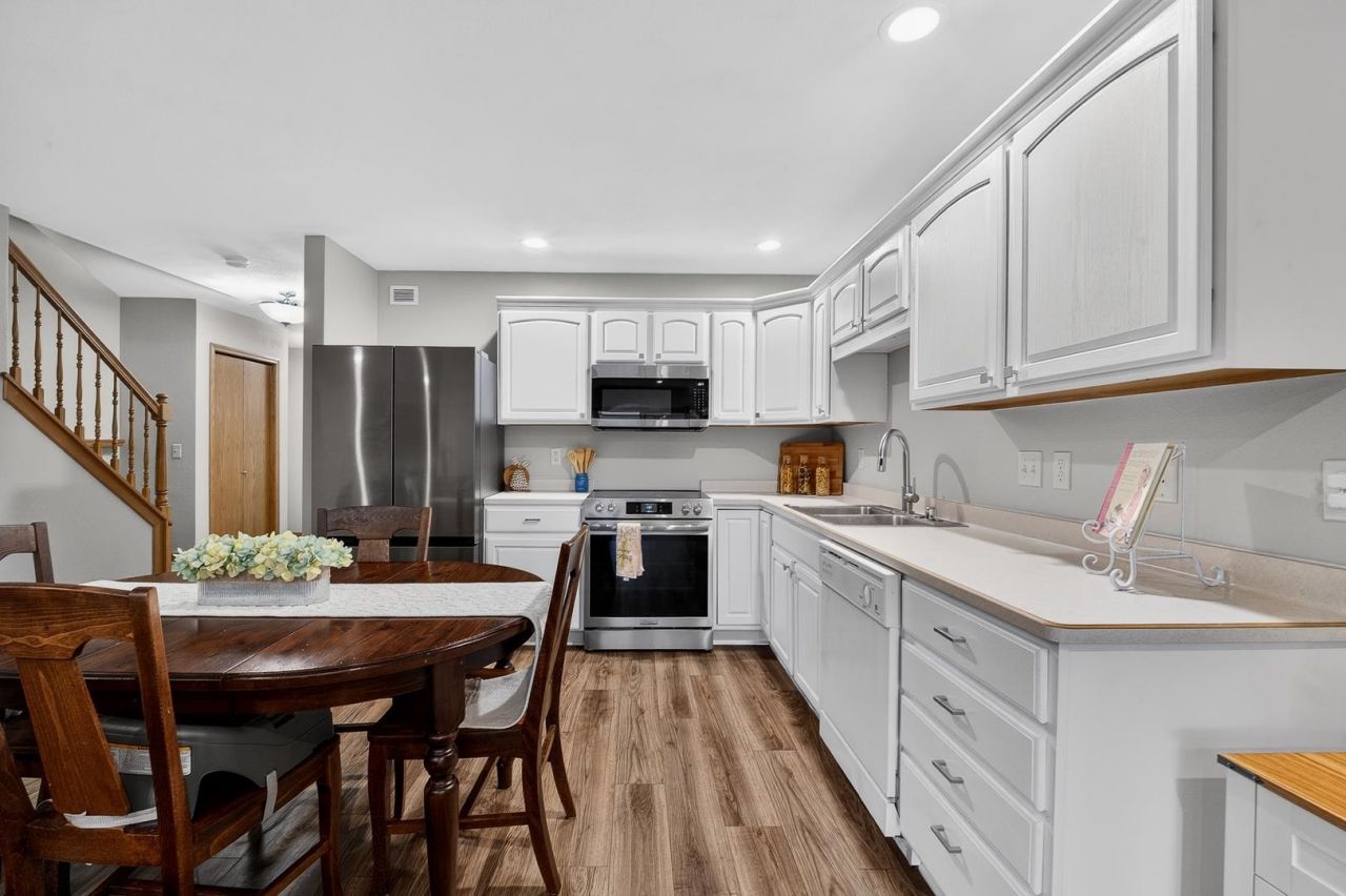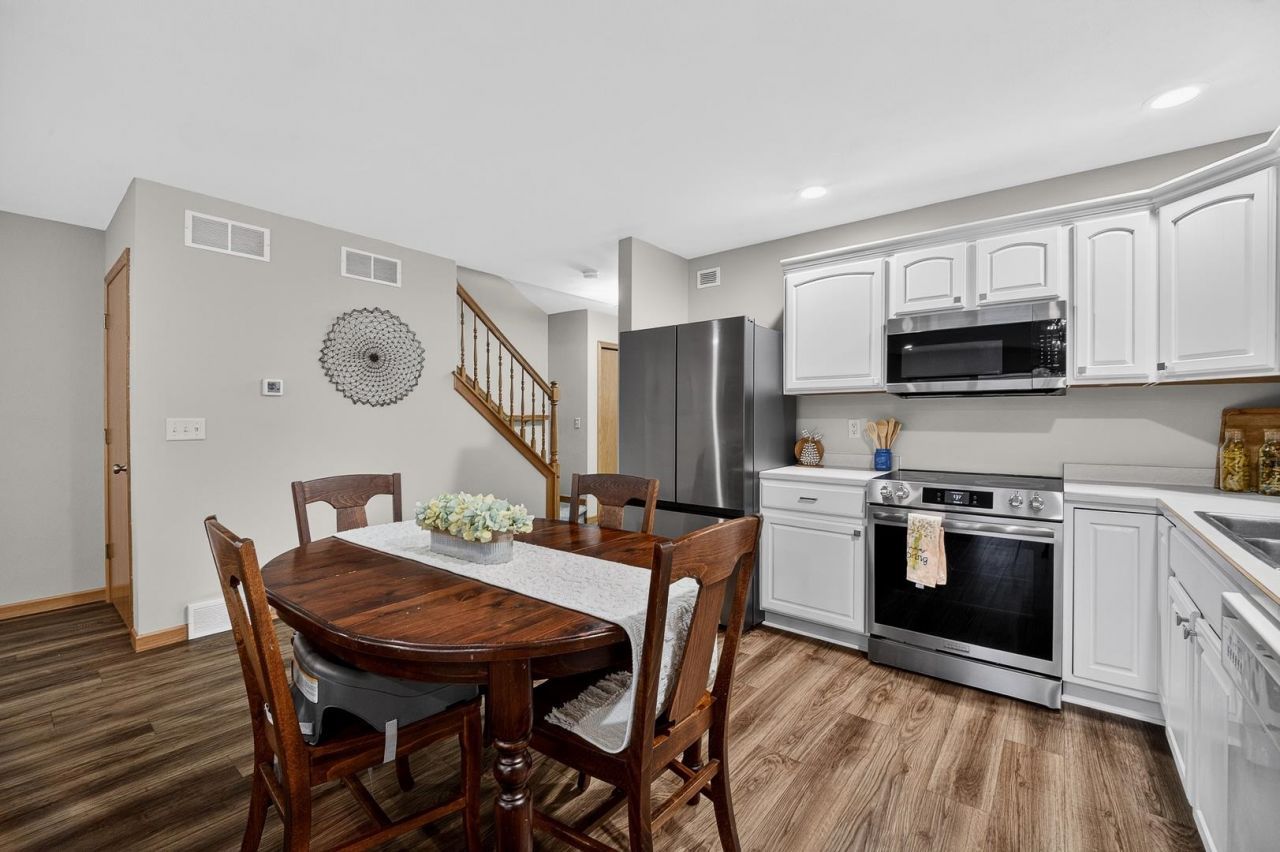 Showings start 4/23. Move-in-ready 2-story townhome condo has everything you could need at an affordable price. Open concept main level living area includes a fireplace and a sunroom (with HVAC, allowing comfortable year-round use). Newer LVP flooring and carpet throughout the condo. Main level also features a 2-car attached garage, washer and dryer, and a half bath. 3 nicely-sized bedrooms on the upper level with a remodeled bathroom. The basement is framed and drywalled for a 1/2 bath and rec room/family room space. Add some flooring, drywall texture, paint and bath fixtures, and you will have an additional ~300 square feet of living space. Financially healthy association with reasonable condo fees. Walking distance to Prairie Athletic Club and Buck & Honey's!