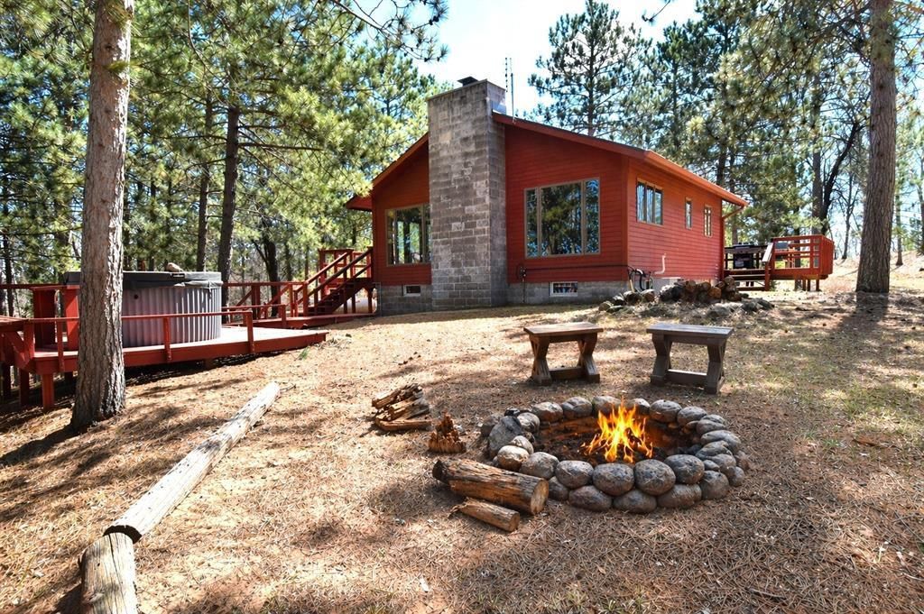 Rustic retreat on highly sought after Webb Lk featuring 3 BR, 1.5 BA tucked down a winding private drive & in tall towering pines awaits! Sold turn-key & ready for you to enjoy day 1. Privacy galore w/171' of frontage, 2.84 acres & stunning sunsets! All tongue & groove pine interior, live edge pine details throughout, log railings, stone wood burning fireplace to cozy up to. Fully finished w/o LL. Many updates in the past few years, including an additional bedroom, remodeled LL bath w/laundry, new roof, flooring, furnace, tankless water heater, ventless LP fireplace, permanent wiring for hot tub, and more! You'll love taking in the peace & quiet in the screen porch on the lakeside perched over the water or on the wrap around deck while you're grilling. Come enjoy this full rec. lake w/761 acres, 1 bar/restaurant, UTV trails galore, county land, & endless recreation await!